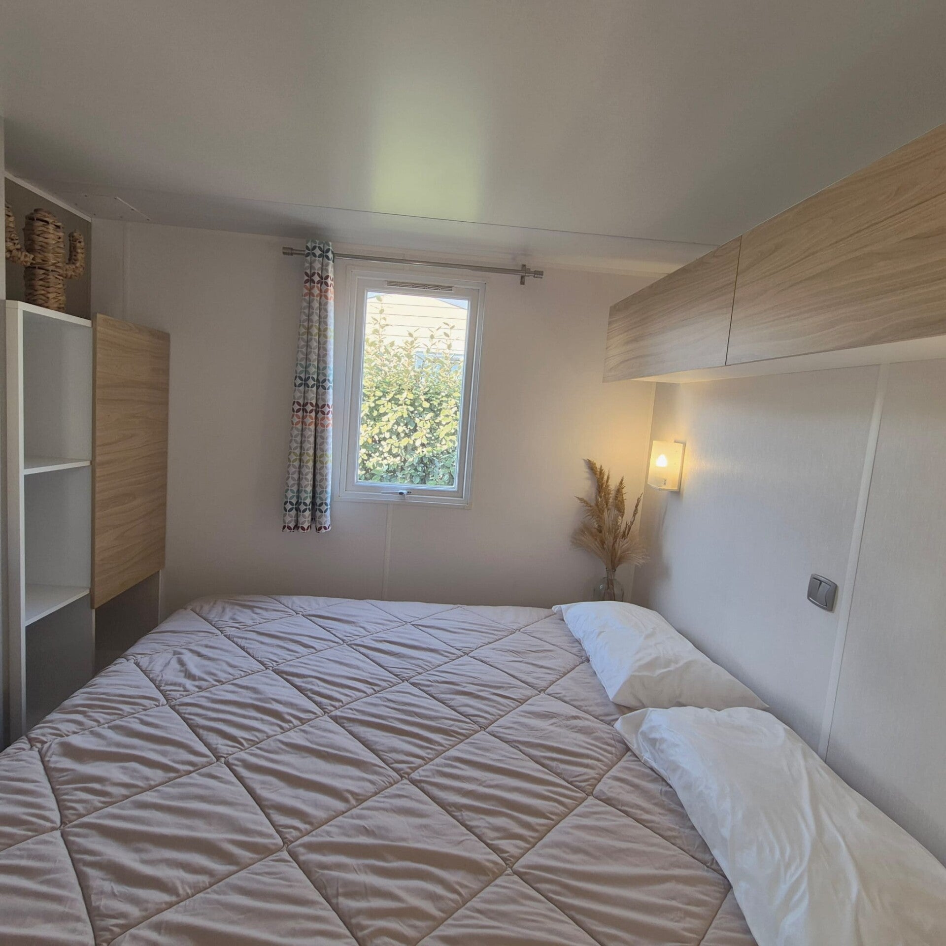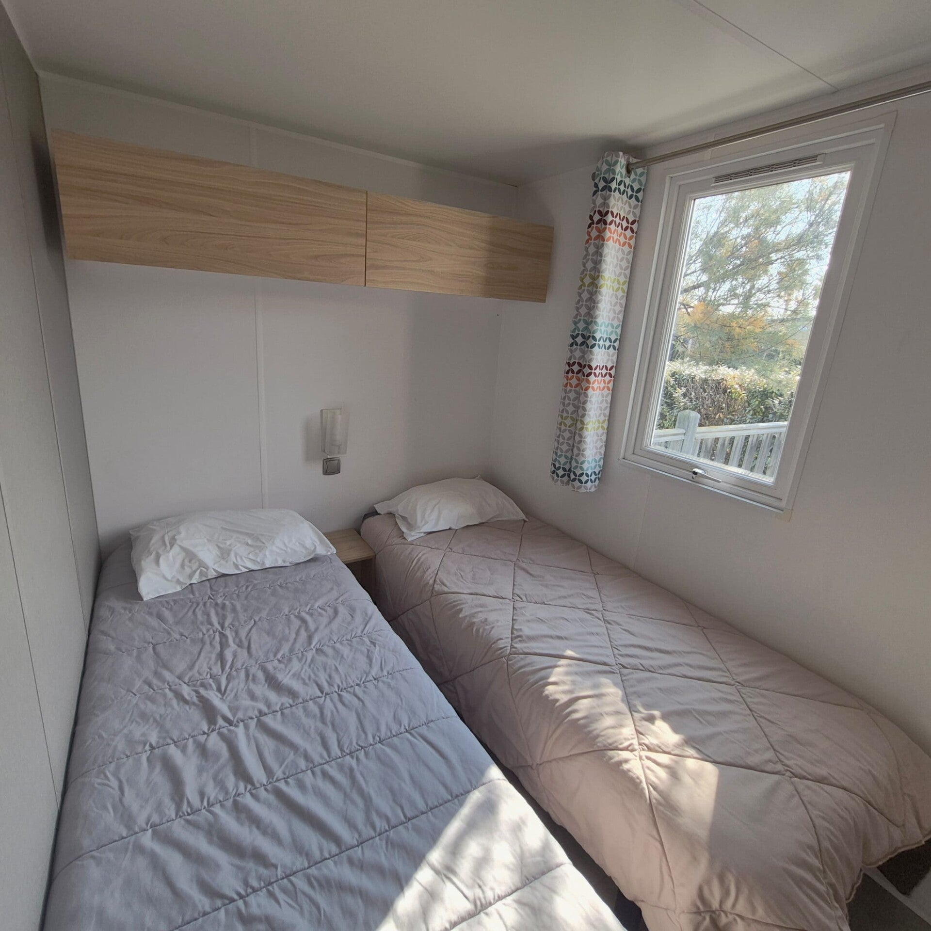 À l’intérieur, vous profiterez d’un espace lumineux et fonctionnel. Le mobil-home comprend une chambre parentale ainsi que deux chambres équipées de deux lits simples chacune, avec rangements.