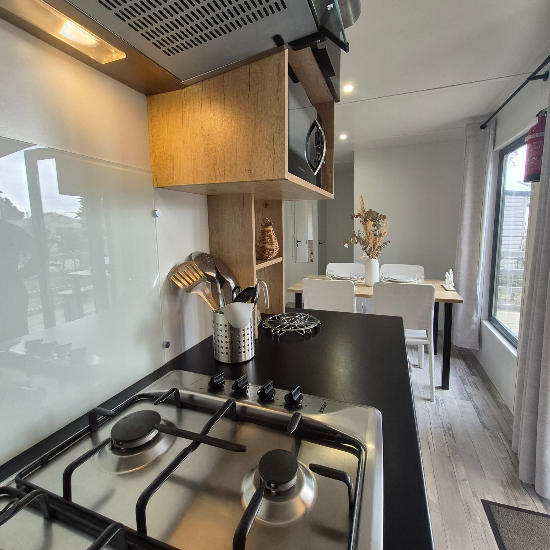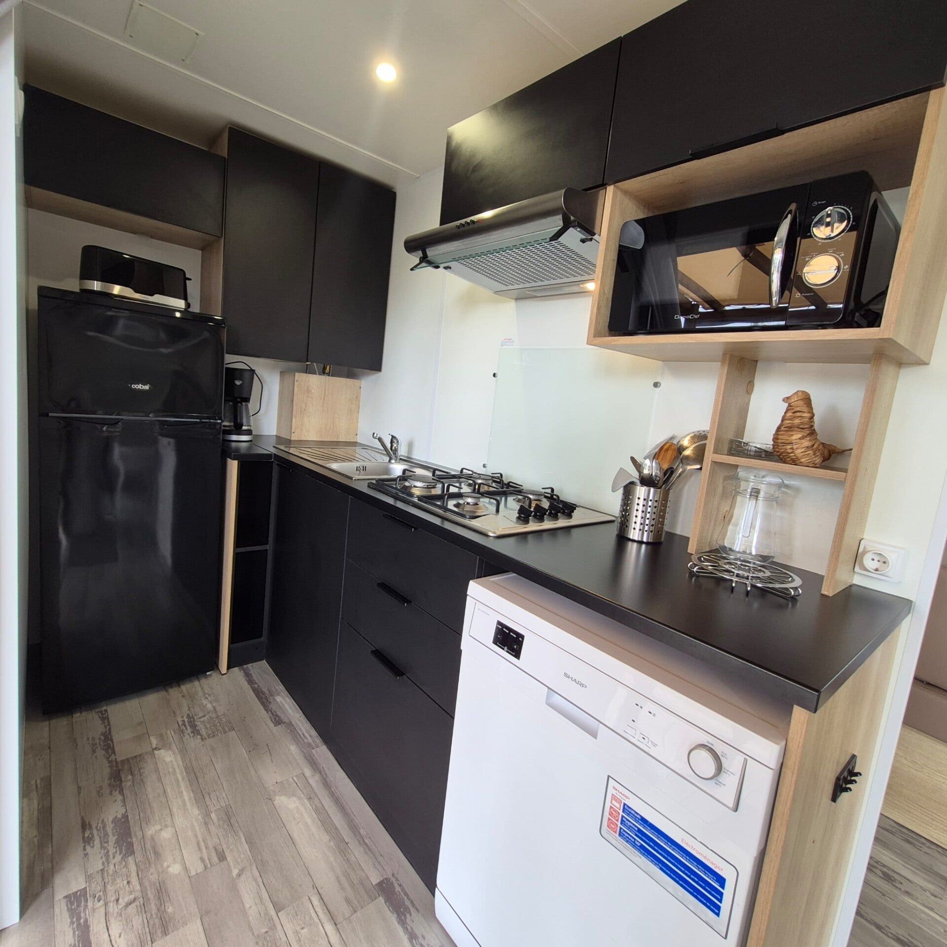 La cuisine, moderne et entièrement équipée, comprend une plaque de cuisson gaz, un lave-vaisselle, une cafetière Senseo, un grille-pain, une bouilloire et tout le nécessaire pour préparer vos repas comme à la maison.