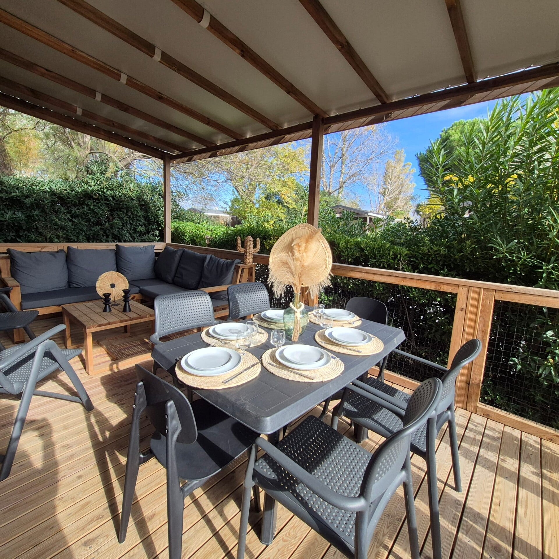 Sa grande terrasse surélevée et entièrement couverte offre un espace de détente à l’abri des regards, parfait pour profiter du plein air en toute intimité.